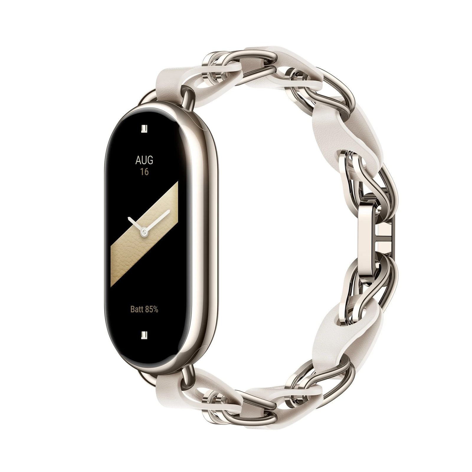 The Xiaomi Smart Band 8 Chain Strap in white features a stylish design with a combination of durable stainless steel and calfskin leather, offering a fashionable look with easy installation. Key features include an adjustable length from 135-200mm, a stainless steel buckle for secure closure, and compatibility with the Xiaomi Smart Band 8. It provides a comfortable fit and a sleek aesthetic for everyday wear.