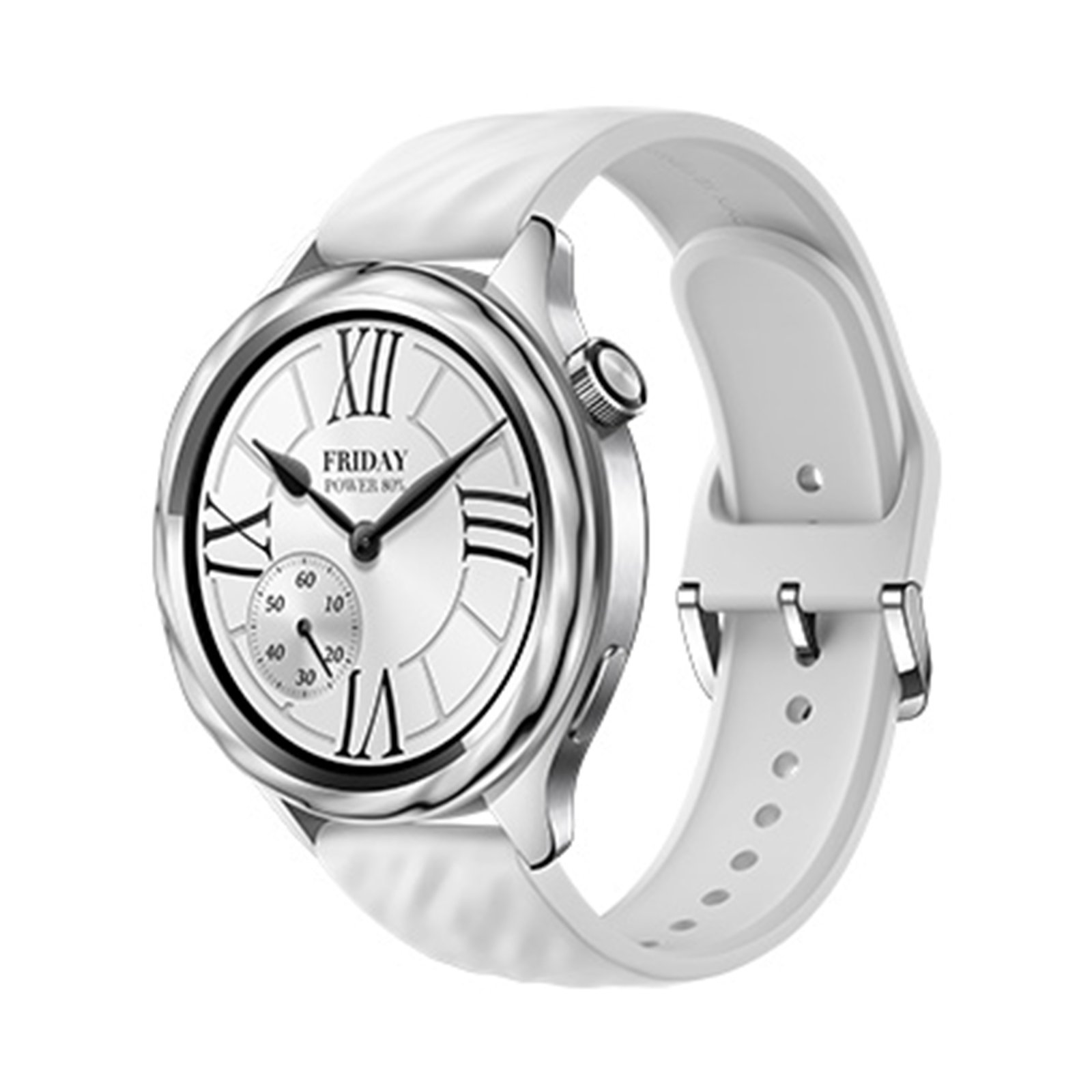 The watch body features a PVD high-gloss finish and a stainless steel rotating crown, designed for both elegance and efficient interaction.